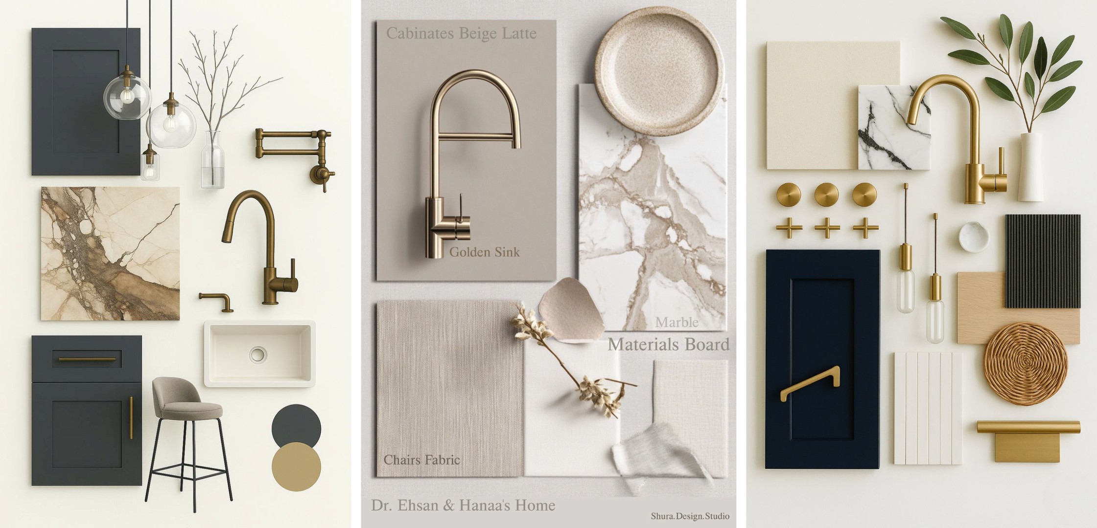 Avoid selecting all finishes from a single showroom display. Materials should be reviewed together under similar lighting conditions.