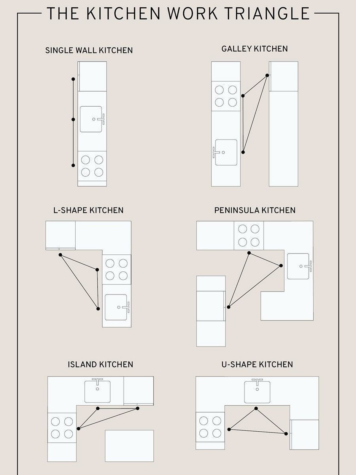 The classic work triangle still applies but has evolved into zone-based planning, especially in larger kitchens.