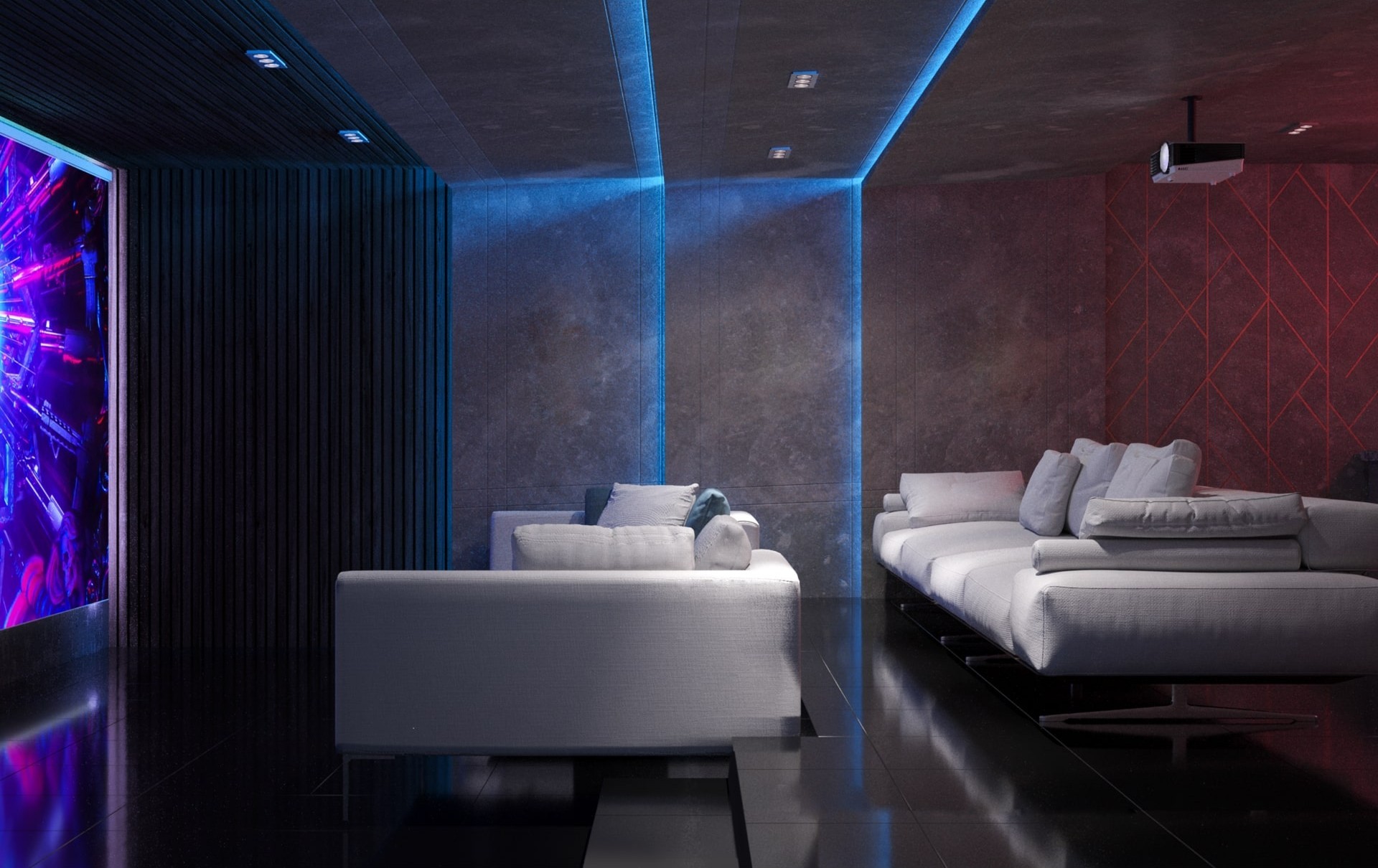 A dedicated home theater designed to deliver an immersive viewing experience through careful spatial planning, acoustic considerations, and controlled lighting. Dark, refined finishes and integrated technology create a focused yet comfortable environment, balancing performance with a clean, modern aesthetic suited for private entertainment.