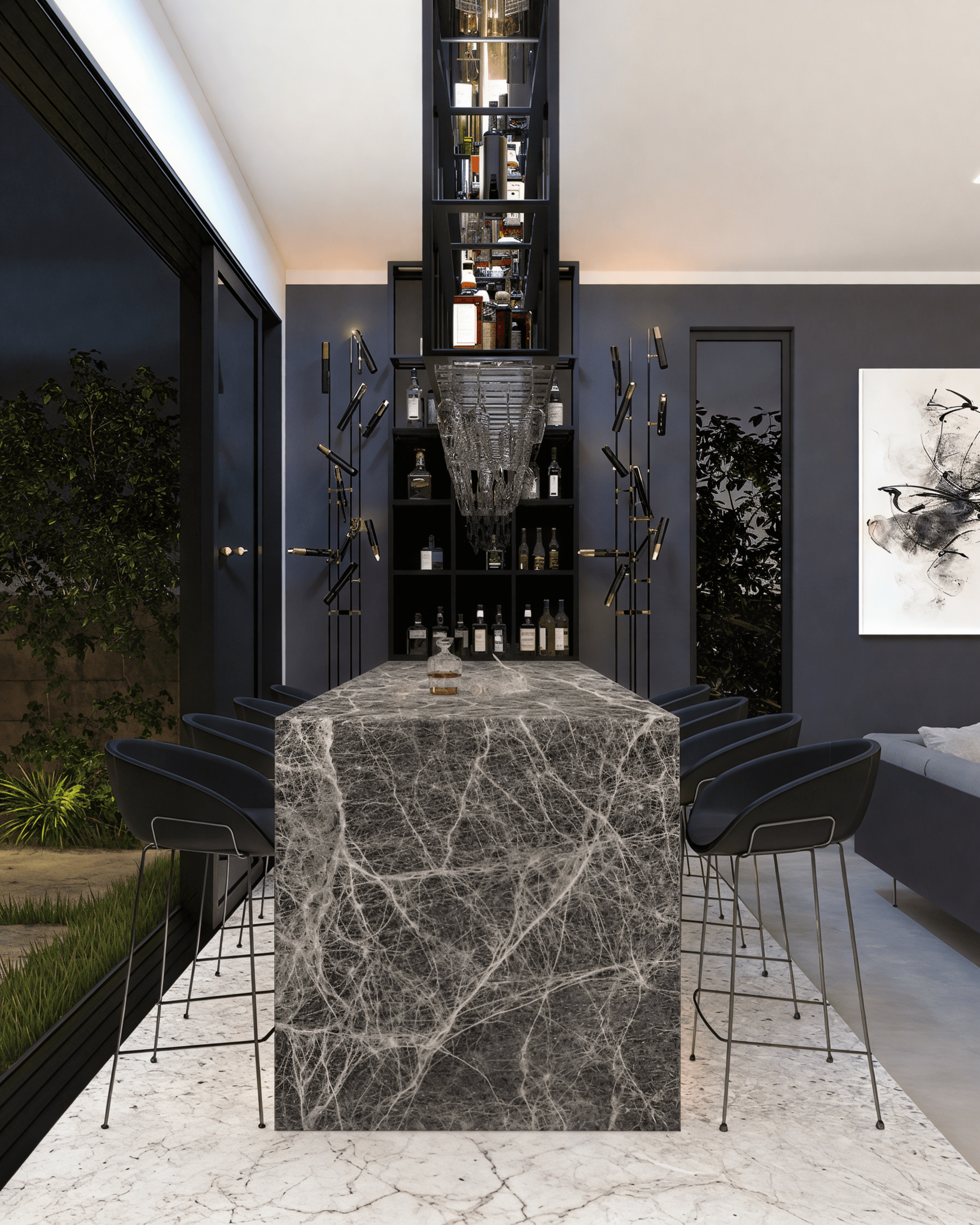 A contemporary outdoor living space designed for entertaining and relaxation, featuring a custom bar, integrated BBQ and kitchen, and seamless indoor–outdoor flow. Clean lines, dark modern finishes, and layered lighting create an inviting yet sophisticated atmosphere suited for year-round use.